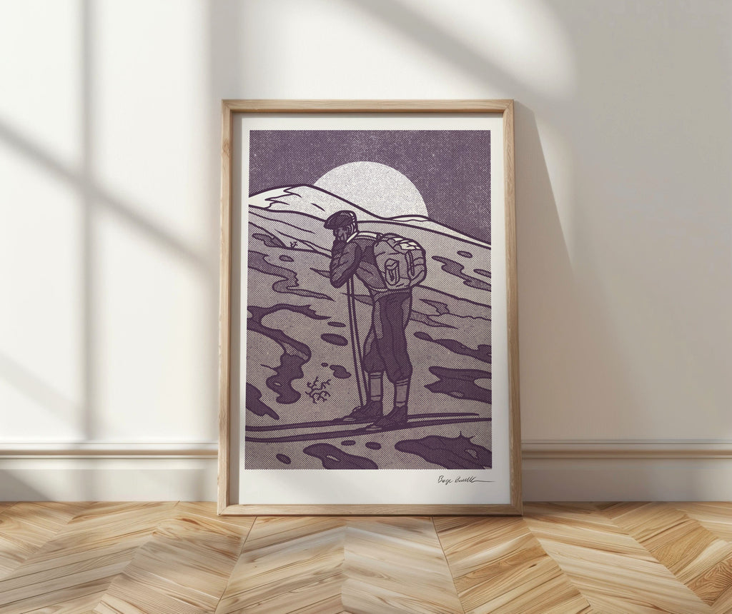 Risoprint i lilla og gulltone på varmt tonet papir. Fargene er ganske nøytrale i naturlig lys. Risoprints er trykket på en gammel maskin og kan variere noe i fra online presentasjon.