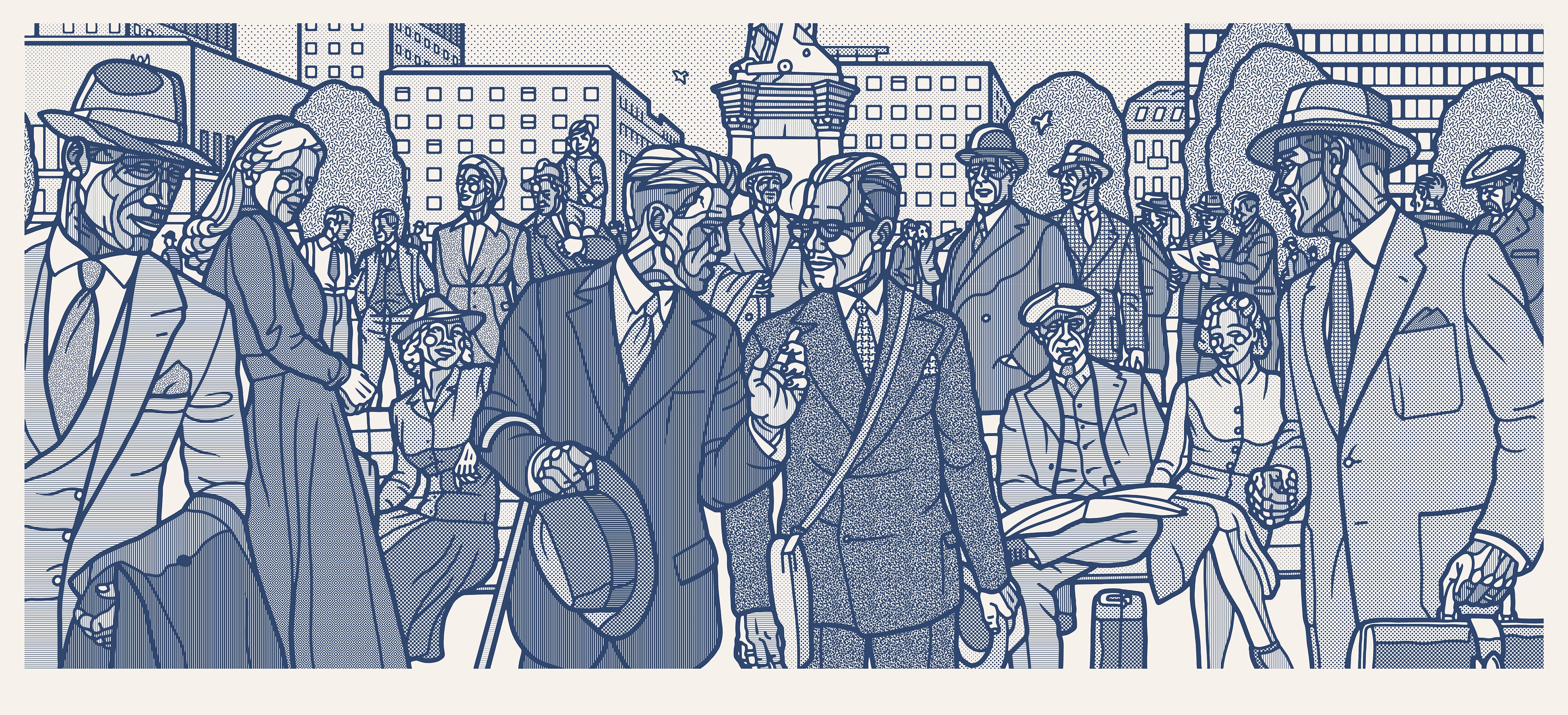Frise av bandende kvinner i forskjellige generasjoner. Saunabrygge og isbad. Håndtrykket silketrykk i begrenset opplag. Zoom in for mønster og detaljer.