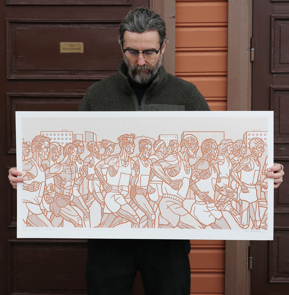 - 100x50cm orange or 80x40cm blue and black hand made screen print on munken cream 300g paper.