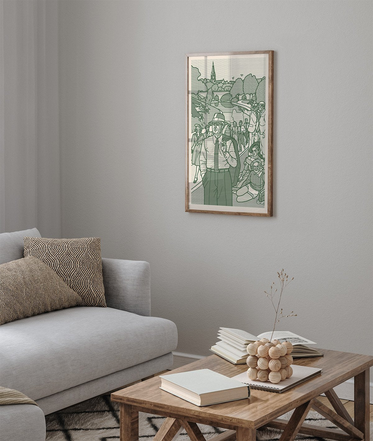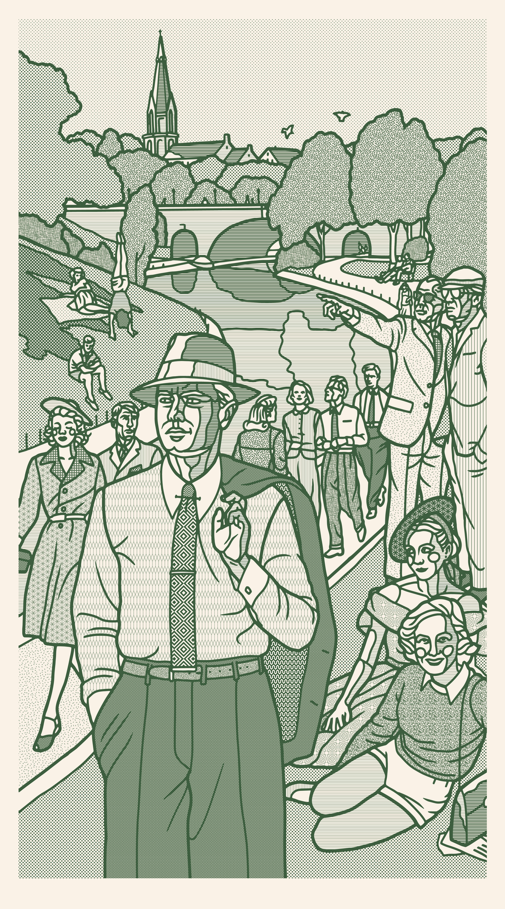 Tall frieze inspired by 1940-1950s Akerselva. Imaginary characters. The combination of color and all the detailed patterns works best in full size.
