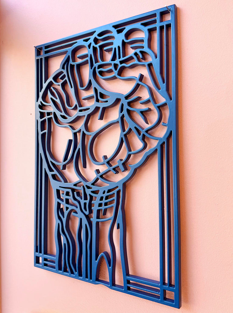 Laserkuttet pulverlakkert aluminium. Kan sees hos Rivertz i Oslo.