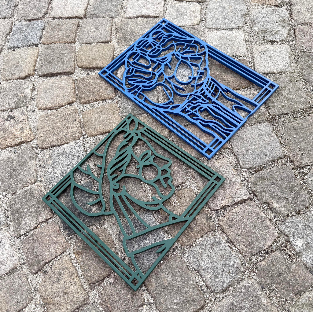 Laserkuttet pulverlakkert aluminium. Kan sees hos Rivertz i Oslo.