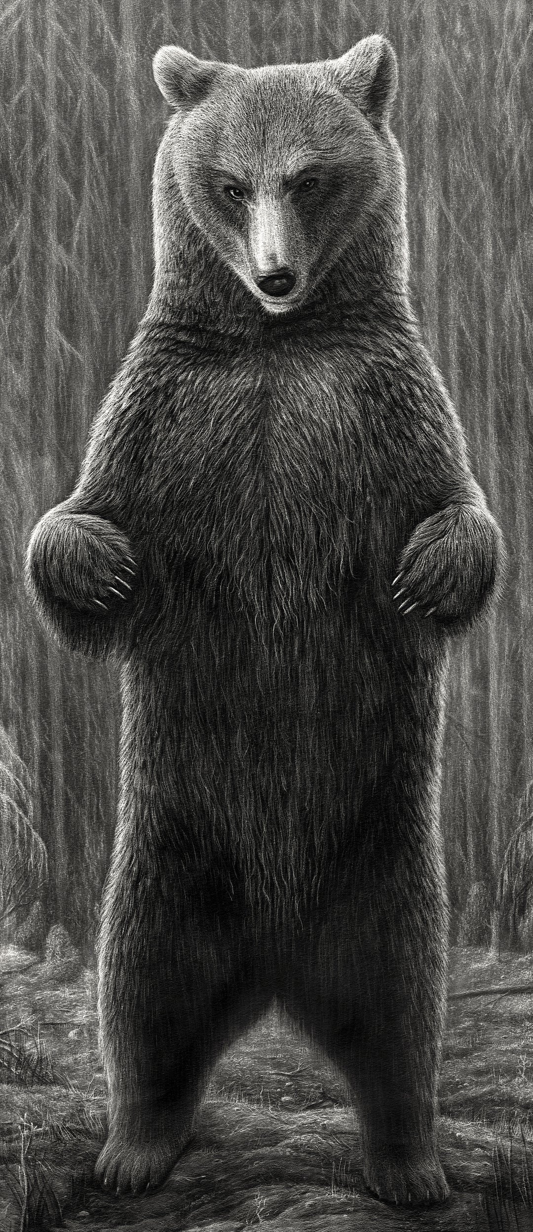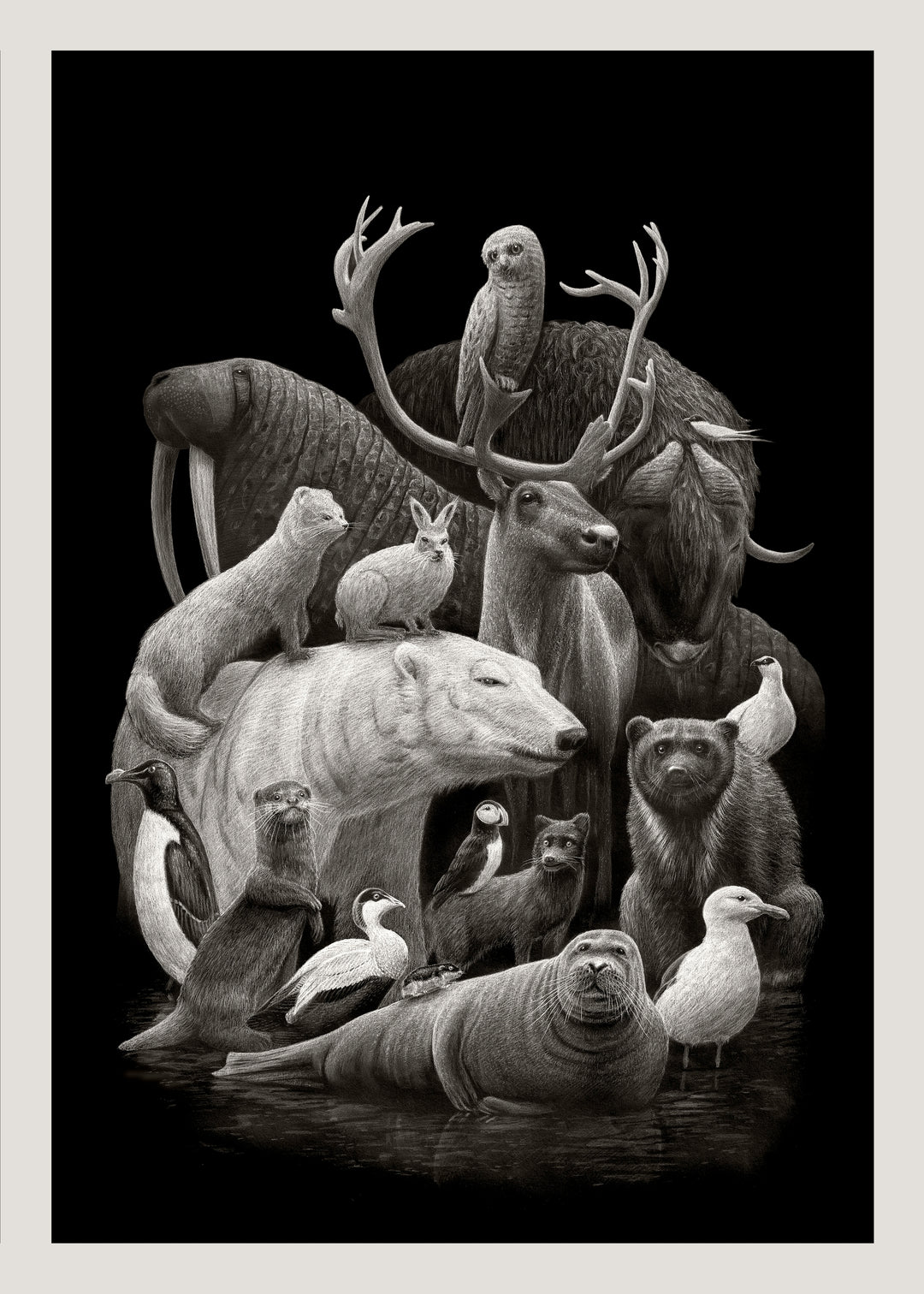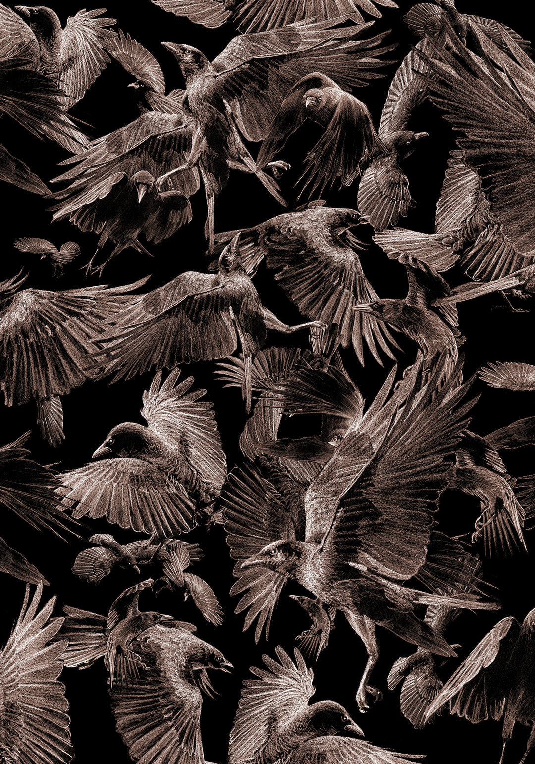 Et utvalg av trykk i tegnet stil, mange invertert. Tegnet med kull og blyant, fotografert og trykket som høy kvalitets DGA.