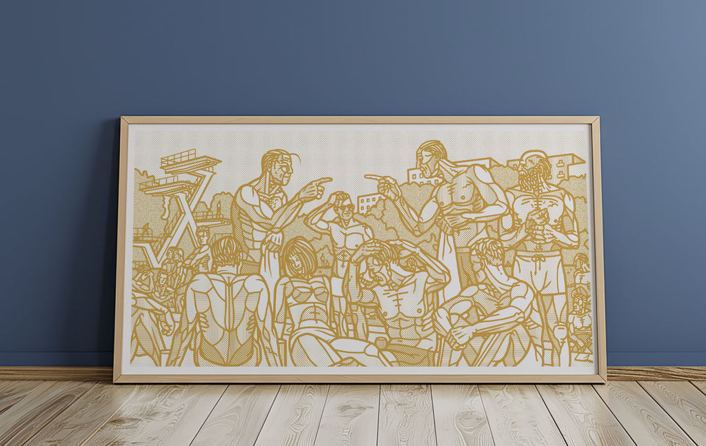 A large composed frieze of characters by an outdoor pool, based on Frognerbadet in Oslo. Extra large. Signed and numbered. Zoom in to see the detailed patterns.