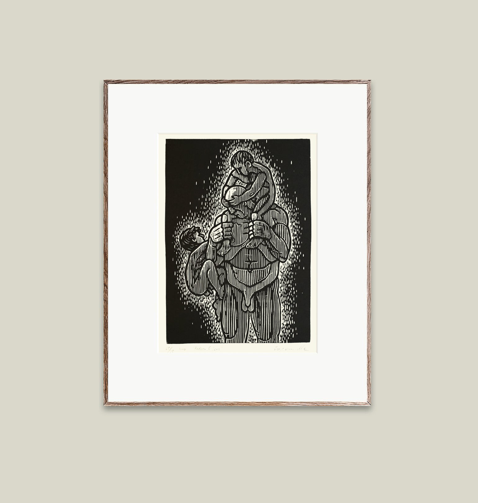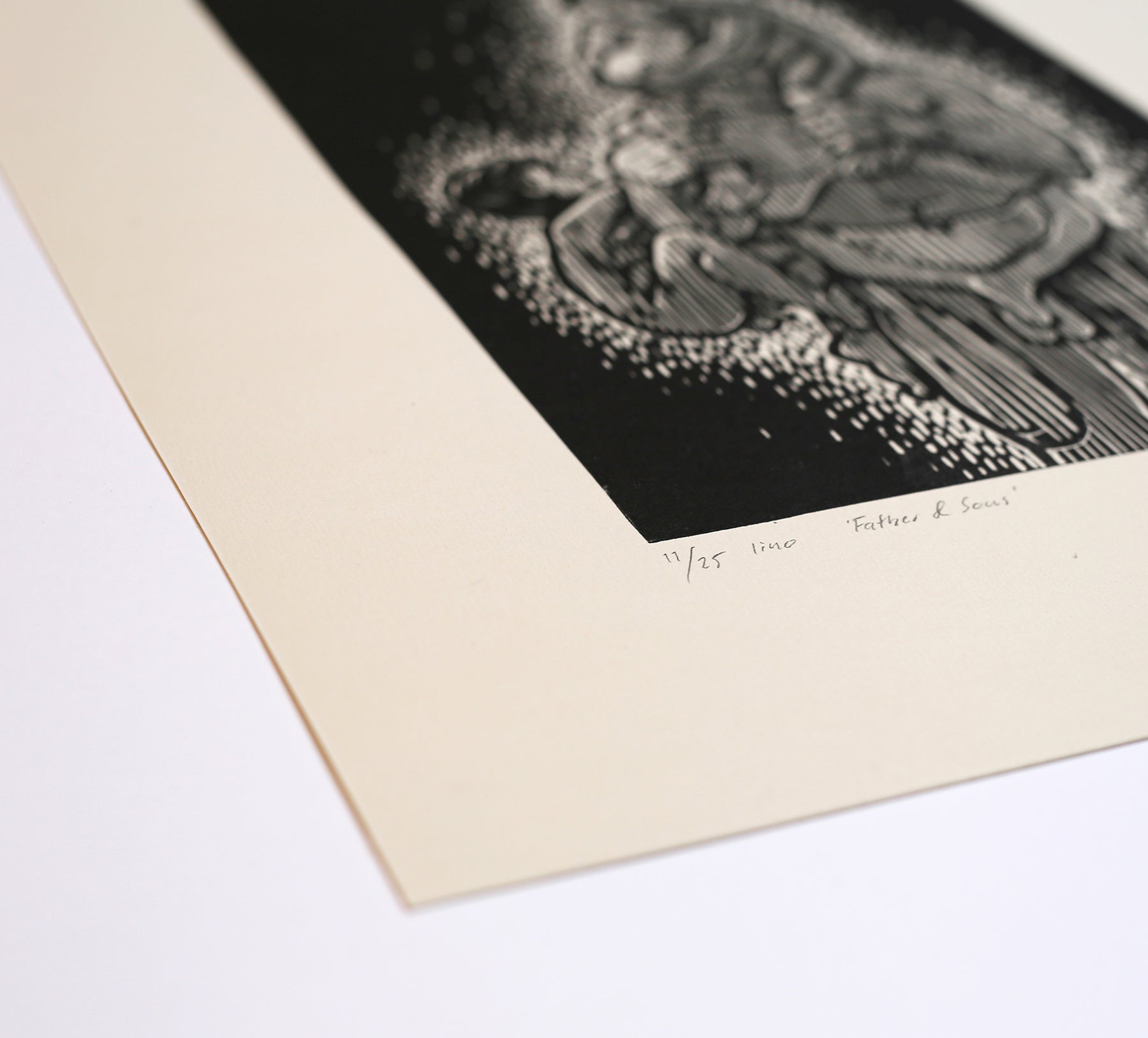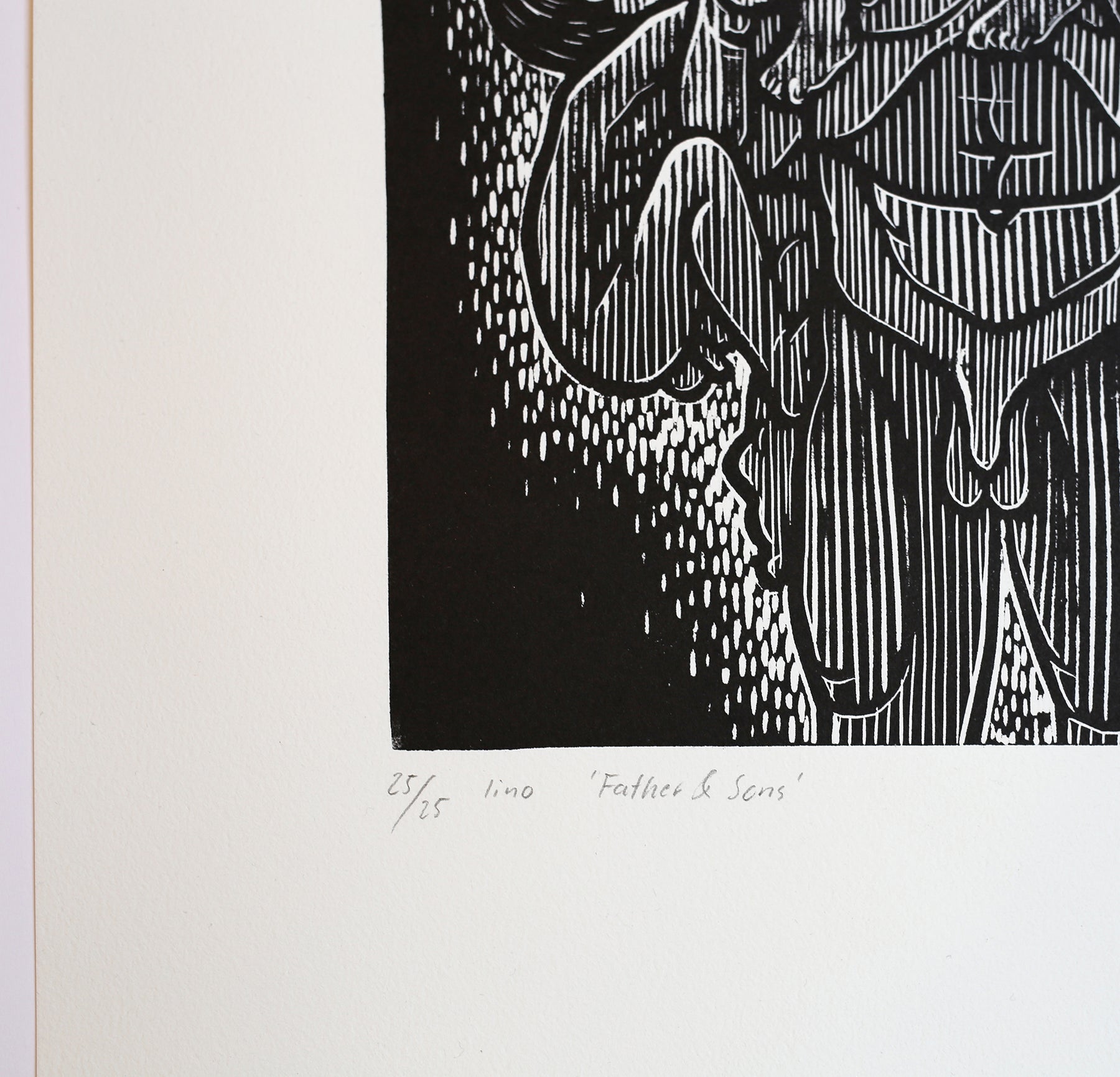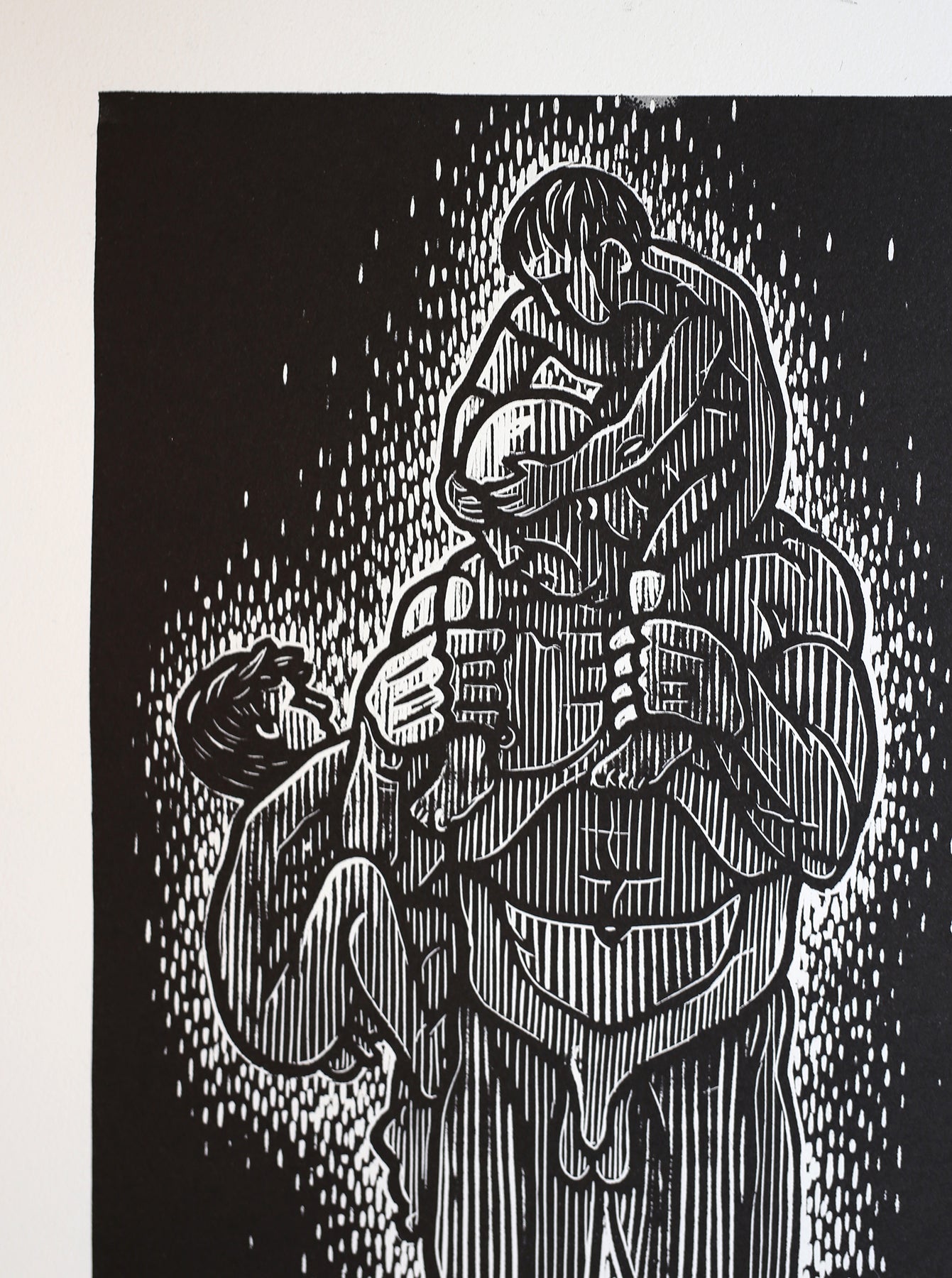 Hand carved linoleum plate, inked and printed by hand in a small edition 35x45cm paper, 250g cotton paper, signed and numbered.
