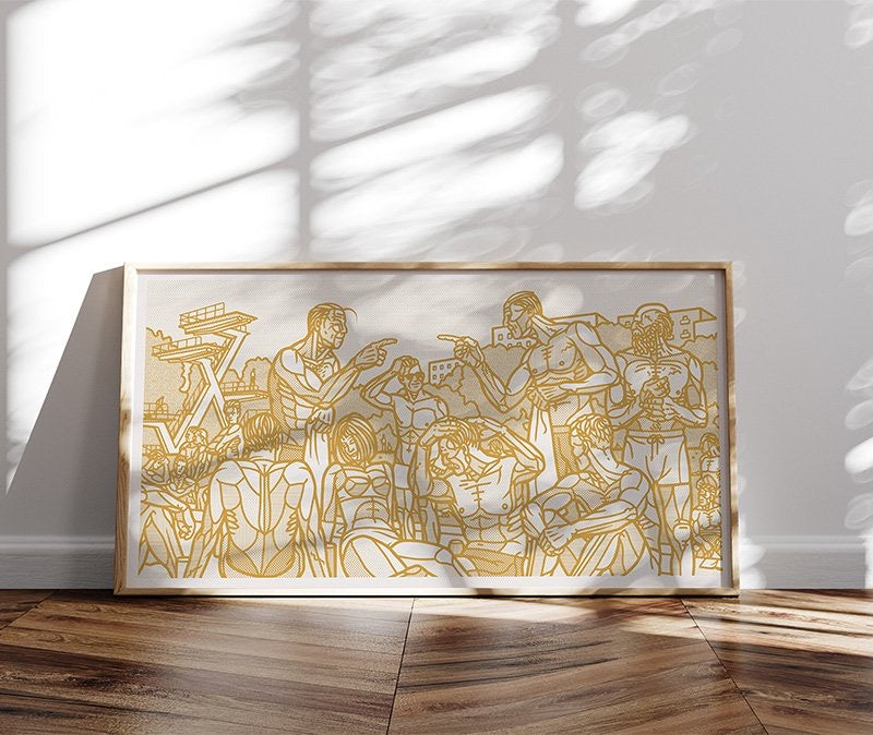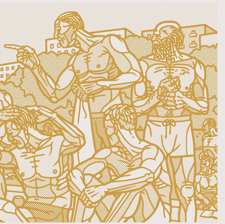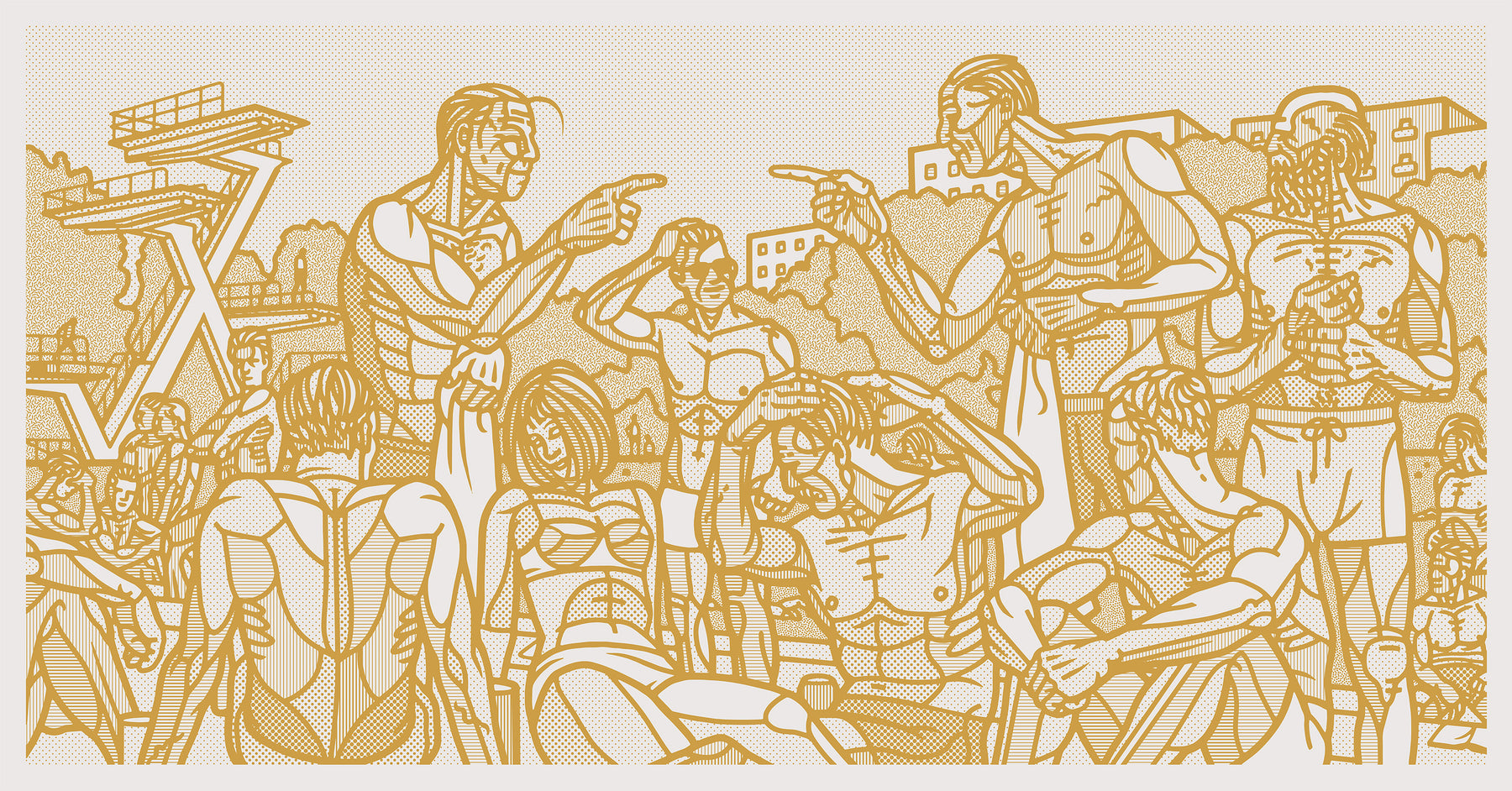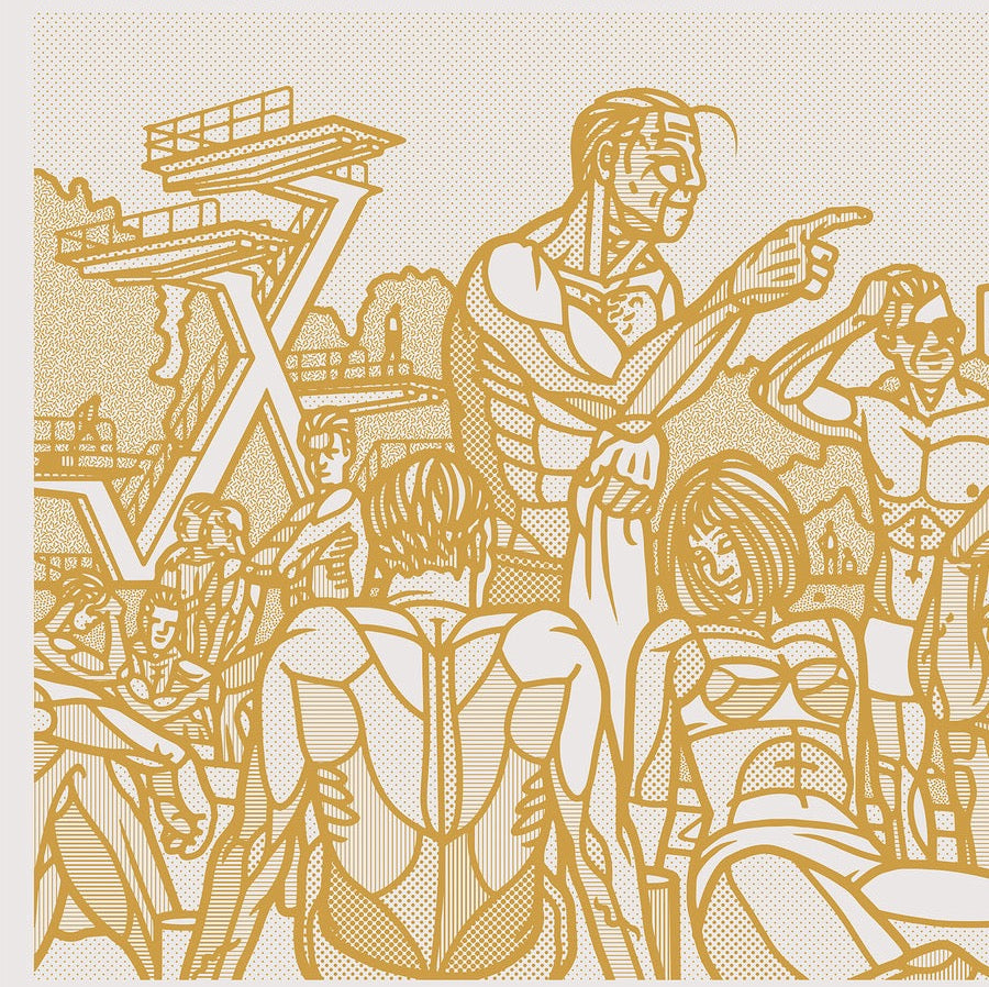 A large composed frieze of characters by an outdoor pool, based on Frognerbadet in Oslo. Extra large. Signed and numbered. Zoom in to see the detailed patterns.