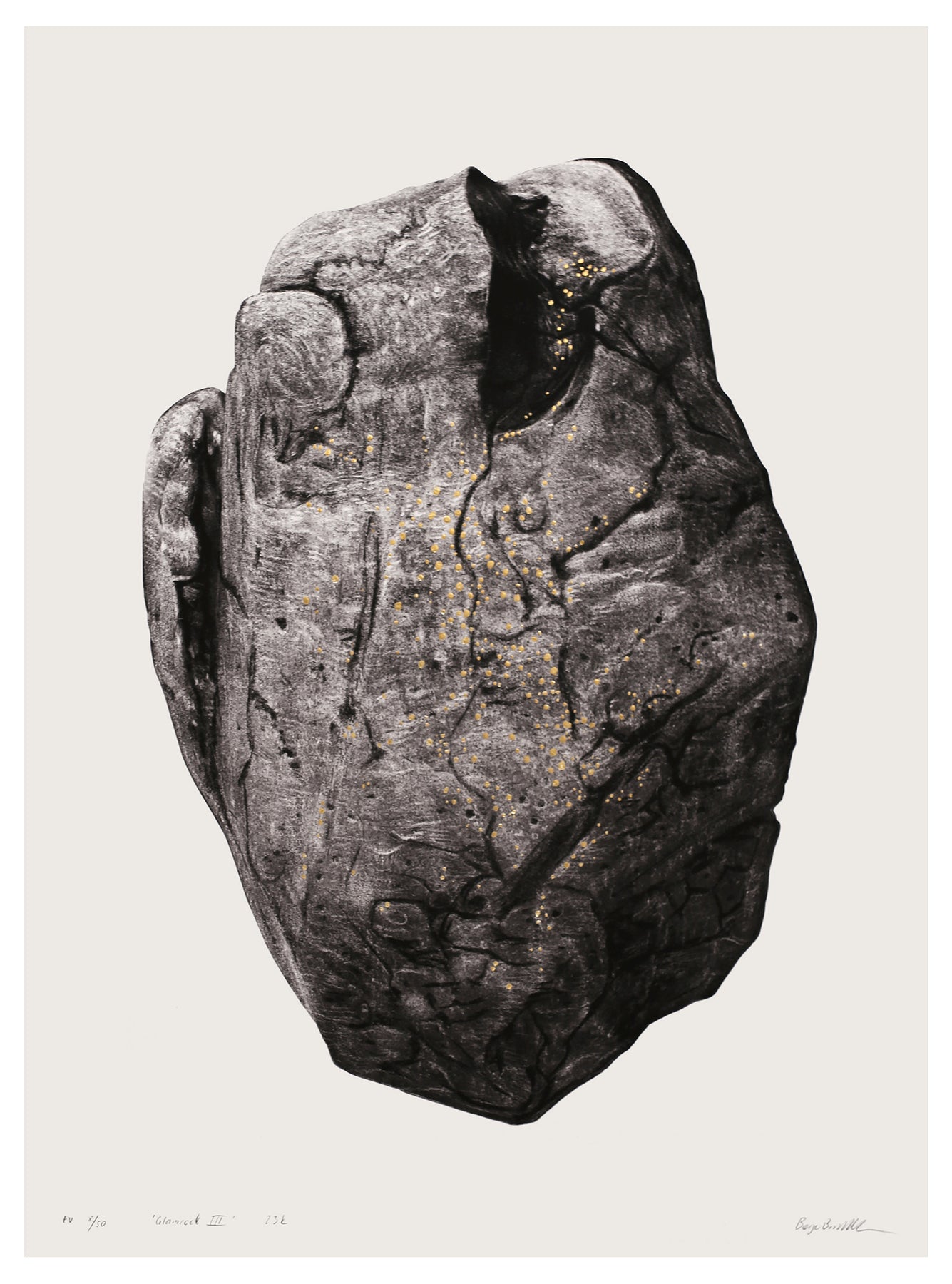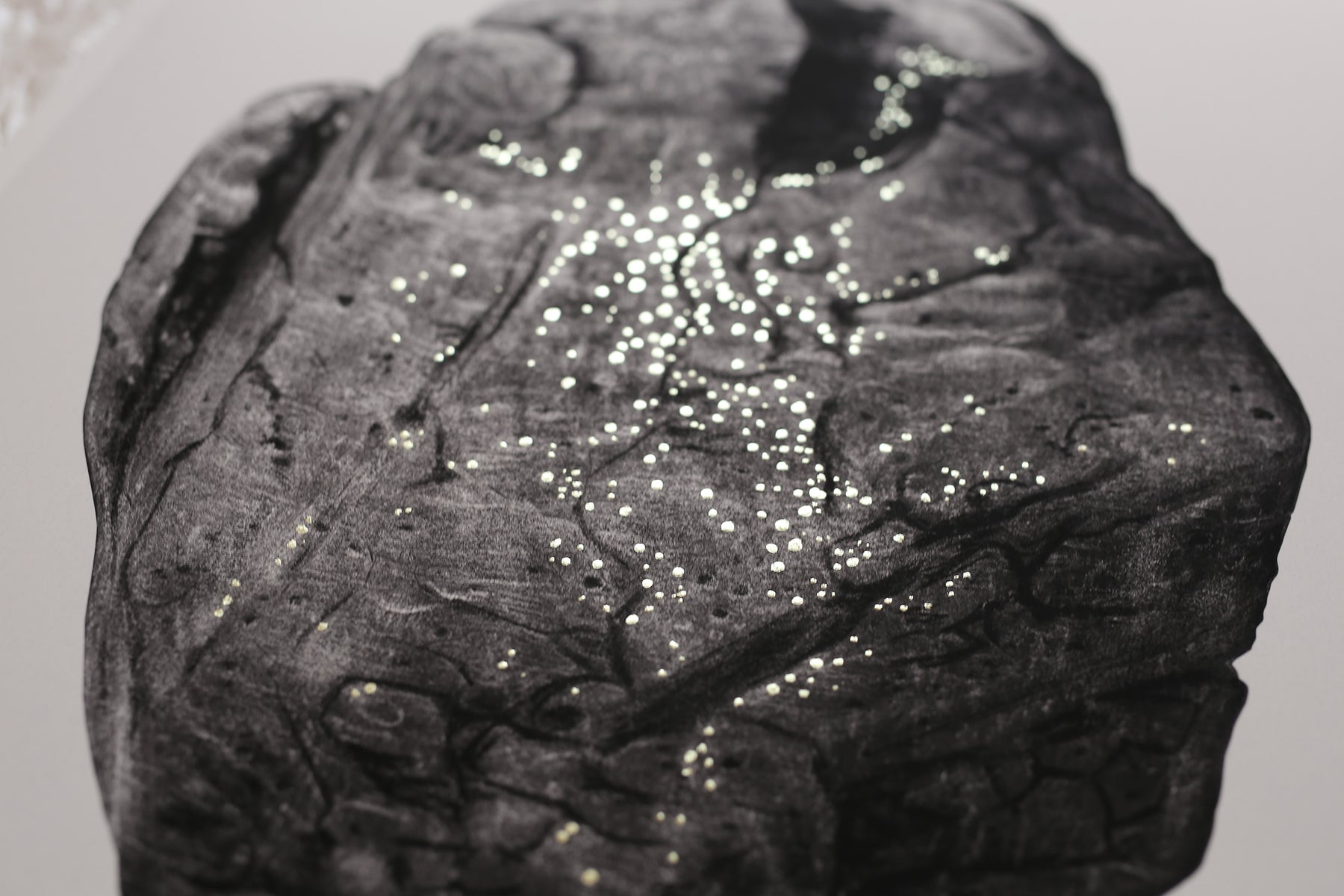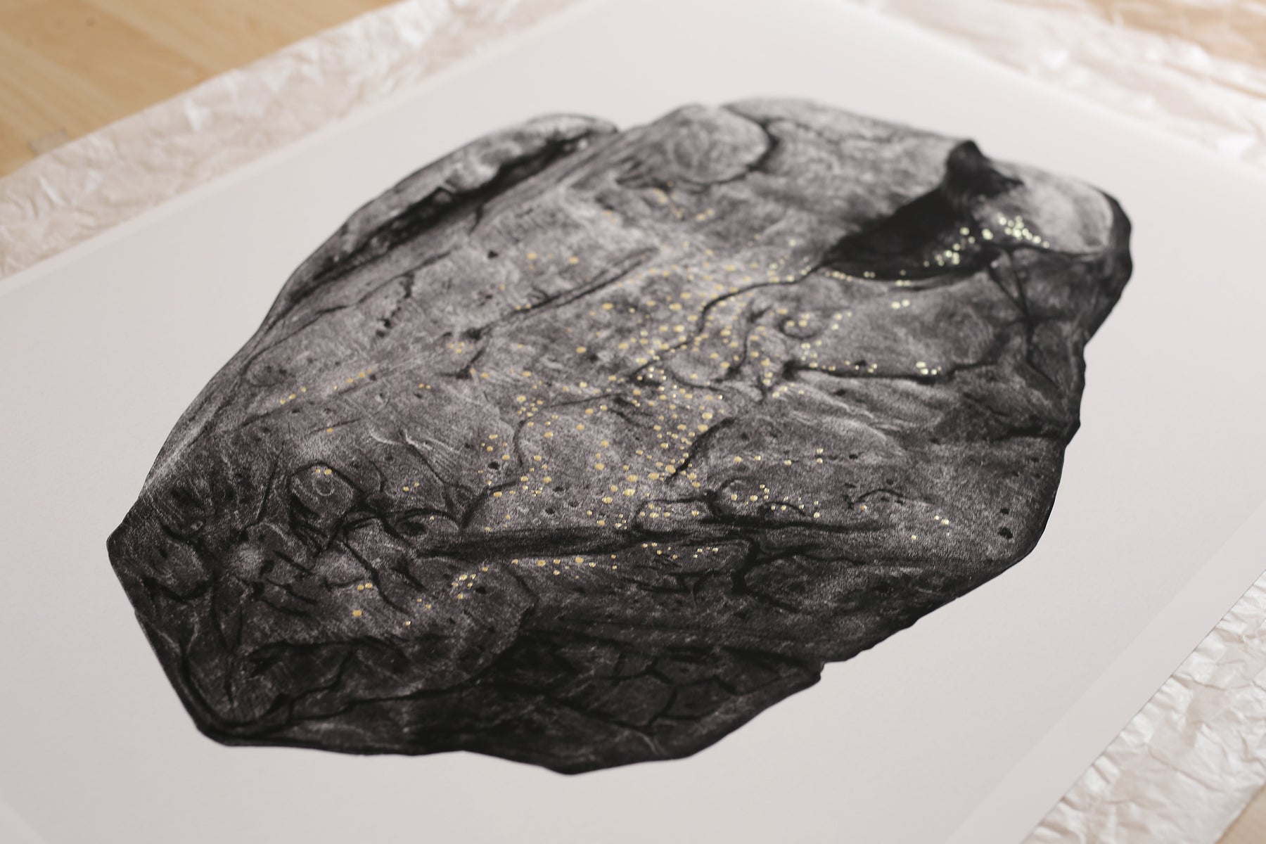 This series of rocks is hand drawn with charcoal then printed on Hahnemühle cotton paper and hand colorized with gold leaf. From a distance they look like normal bold rocks but from the right angle the gold details shine. I add the gold by hand so each print is unique.