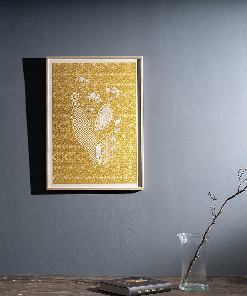 Screenprinted individually by hand, signed and numbered. The combination of Ochre yellow on warm toned paper works best full size.