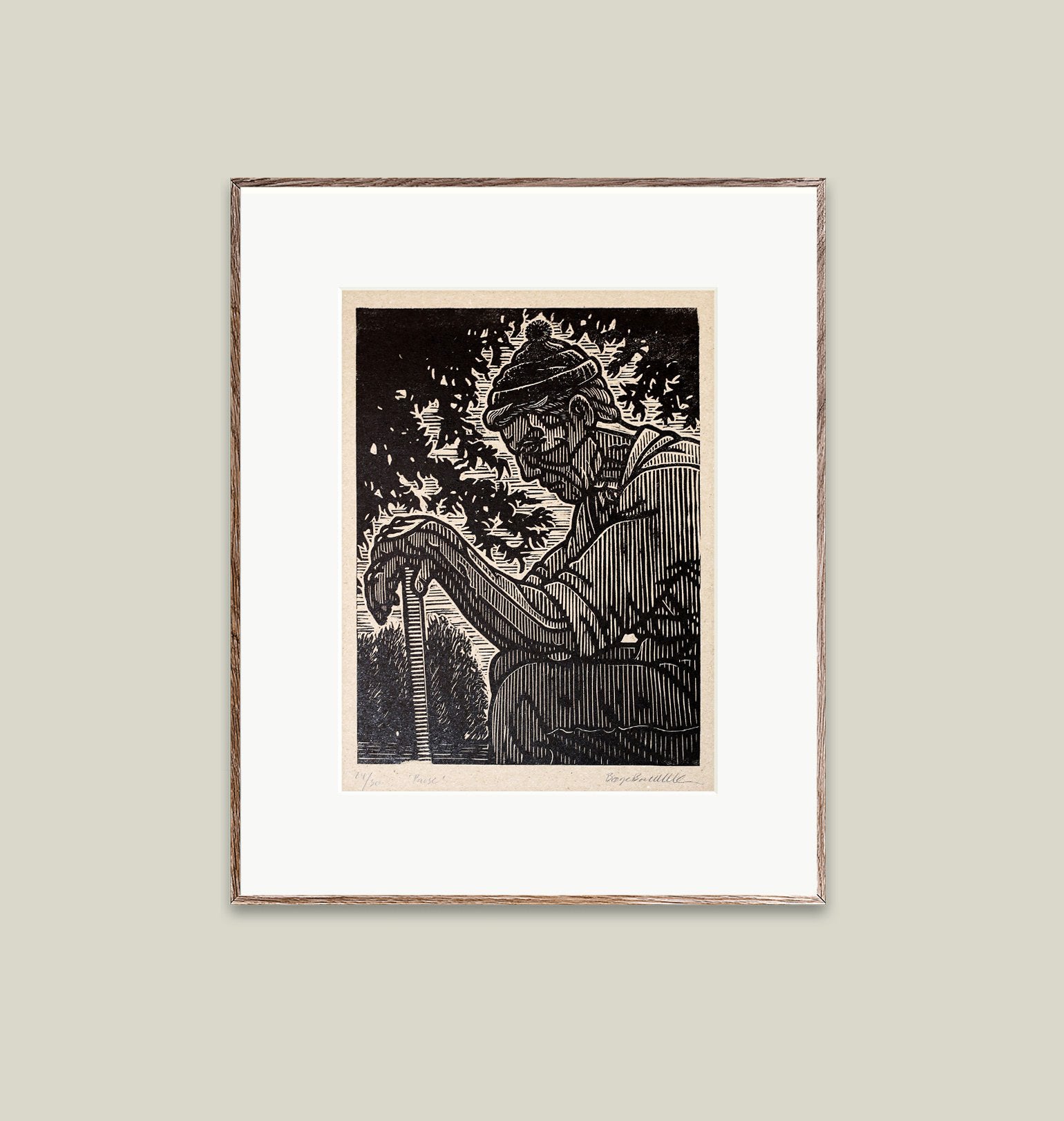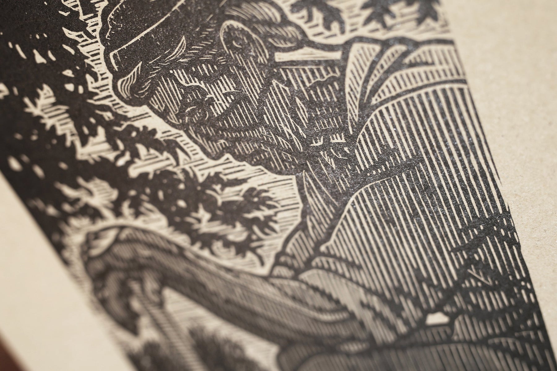 This is a hand carved linocut plate measuring 21x28cm, inked and printed by hand in a small edition on 35x45cm on my favorite paper Kitaka Select, 110g beige Washi (90% Cotton).