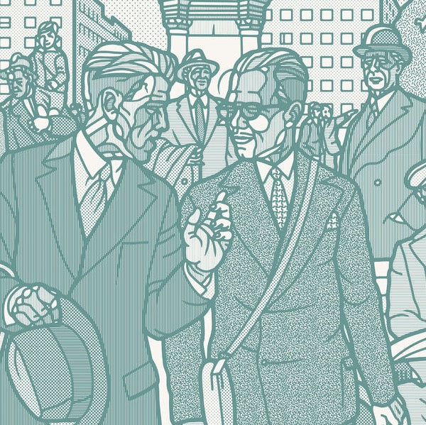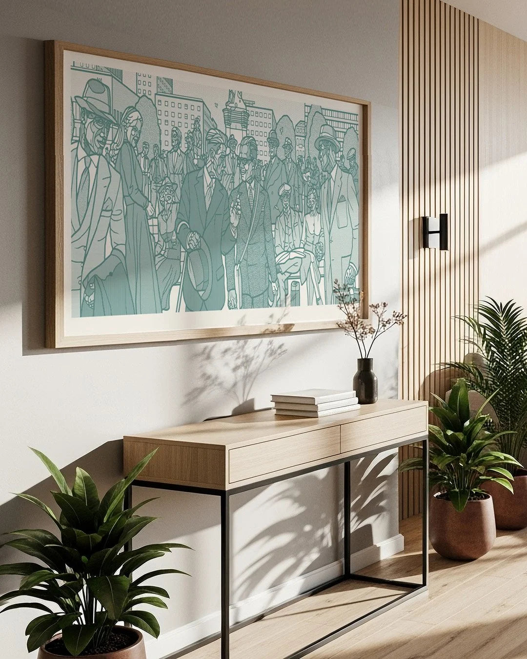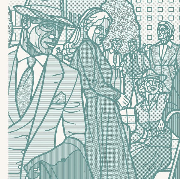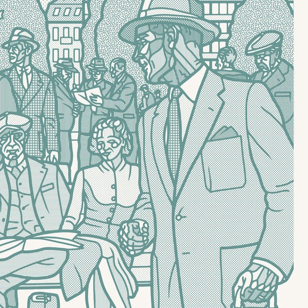 Stort trykk på lerret tilgjengelig i to farger, Mose eller turkis. En frise med karakterer fra Rådhusplassen tidlig forrige århundre. Oppspenning og evt L ramme kommer i tillegg. Bestilller du fra oslo området kontakter Frameshop Sagene deg ang ramme. Zoom inn for å se de detaljerte mønsterene.